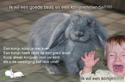 Als je een konijn wilt aanschaffen vergeet dan niet dat je verantwoordelijk bent voor het dier! Konijnen kunnen erg oud worden ( het oudste konijn ter wereld was 18!) Denk dus goed na voordat je een konijn koopt! Je zal altijd de verantwoordelijkheid voor het beestje dragen! Mocht je niet meer kunnen zorgen voor het konijn om welke reden dan ook, zorg dan dat het diertje goed terecht komt bij nieuwe eigenaren of breng het konijn naar een dierenopvang!